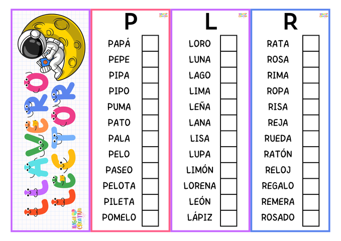 Más de 350 palabras con sÃlabas simples y complejas, organizadas por letra. Ideal para aprender a leer de forma progresiva y divertida. Incluye 5 portadas ilustradas para elegir.